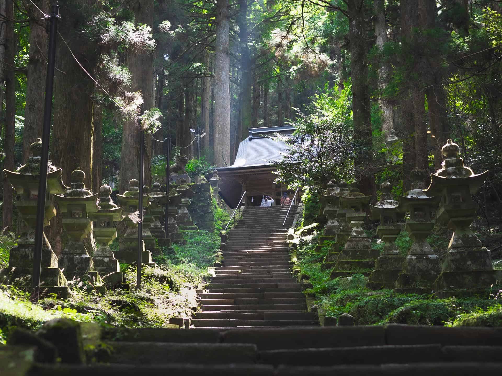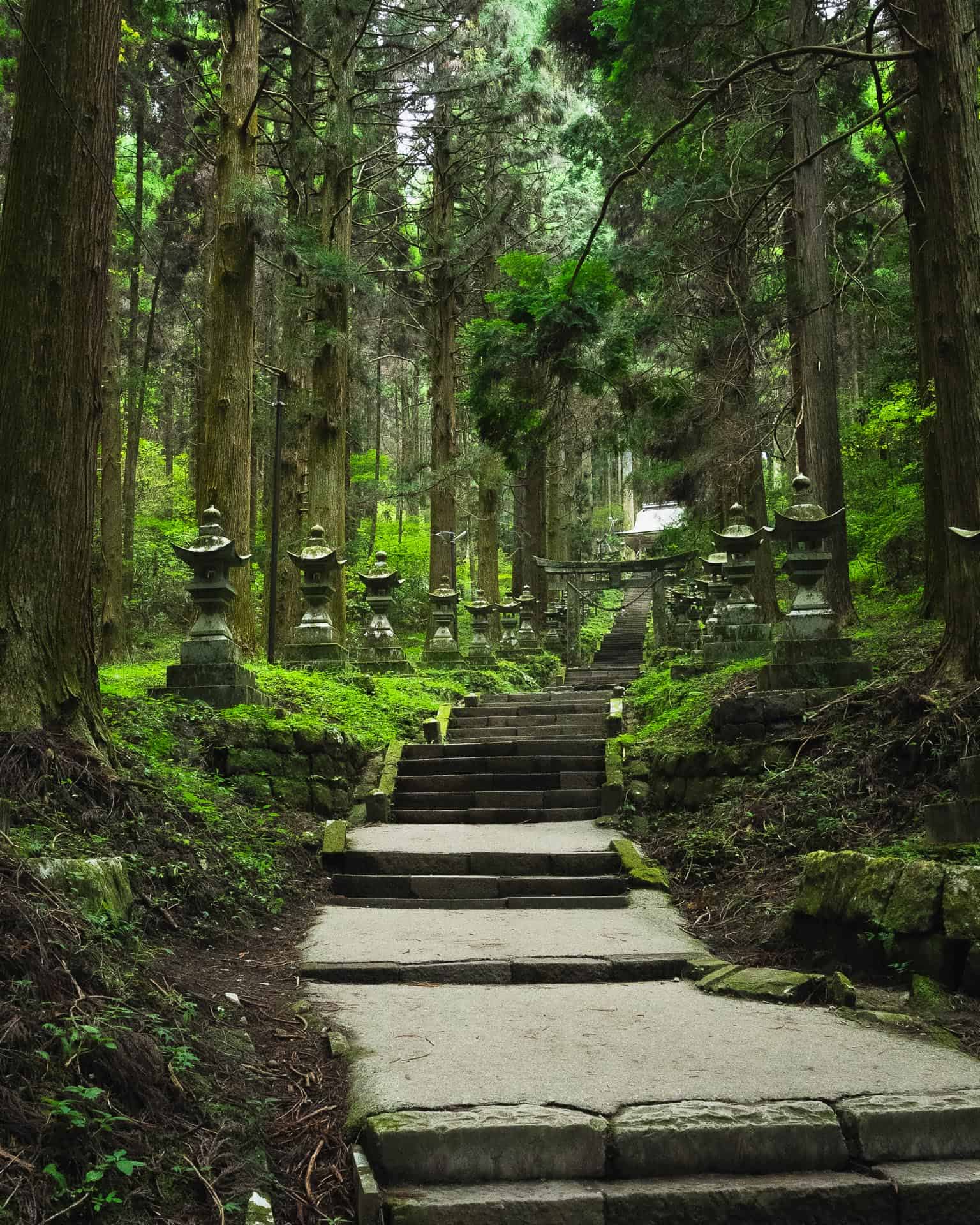 The Kamishikimi Kumanoimasu Shrine is one of the most incredible shrines in Kyushu. The shrine sits beneath a cypress forest on the outer slopes of Mt Aso. Walking up to the shrine is nothing short of magical, you pass by 100 moss-covered stone lanterns that line the steps up to the shrine.