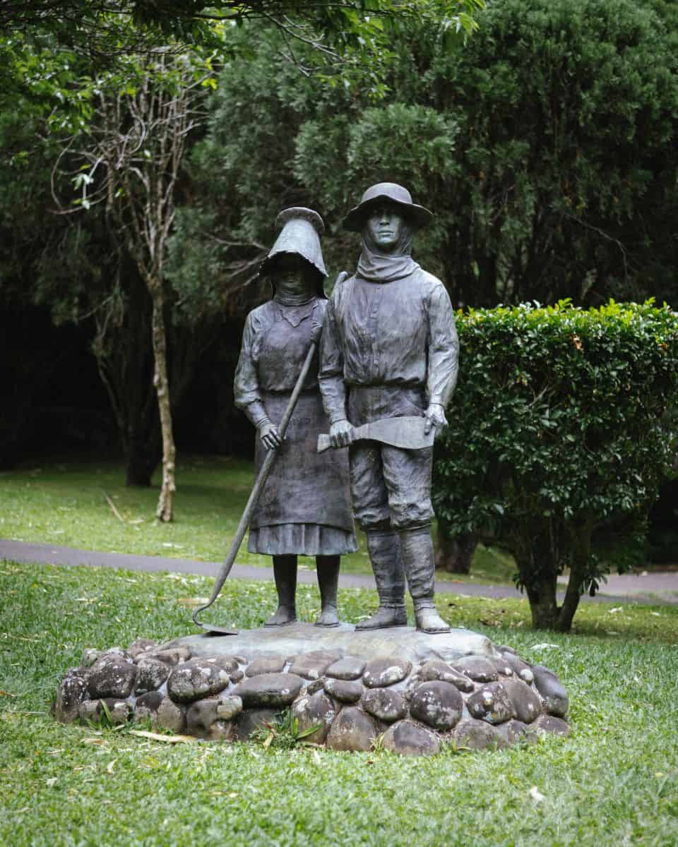 At one end of the garden, a powerful monument commands attention – bronze statues of Japanese cane field workers.