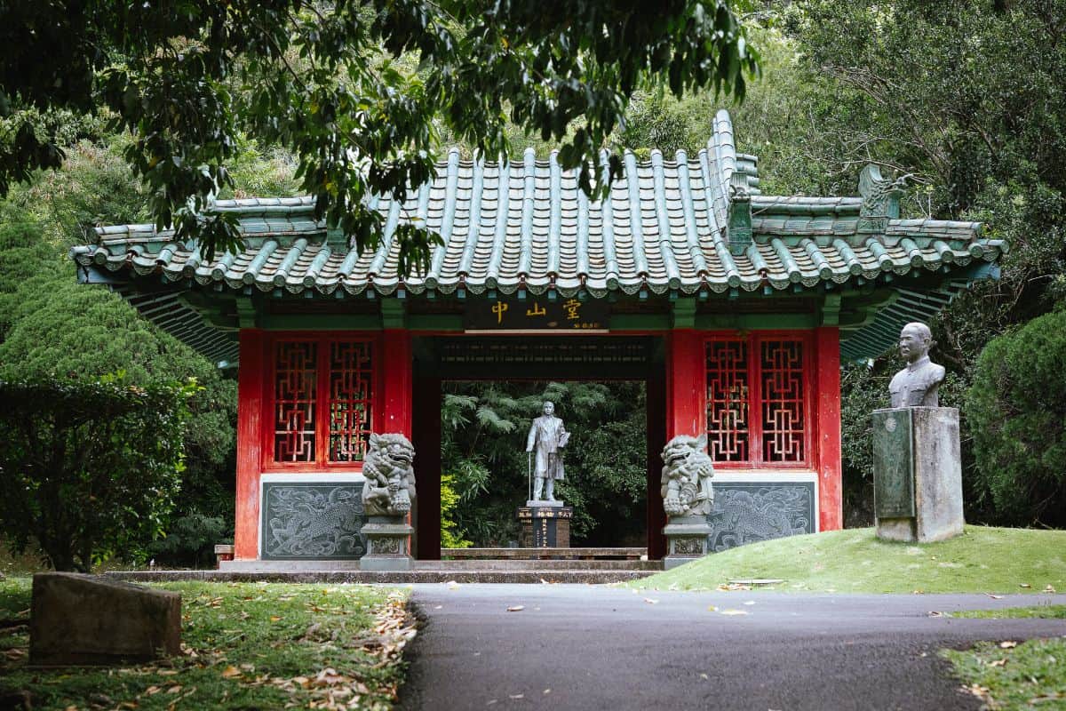 A traditional Chinese pagoda sits at the center of the Chinese Garden, a nod to the ancient architectural style. This ornate pagoda provides a quiet retreat to pause and soak in the ambiance. Behind the pagoda is a statue of Sun Yat-sen.