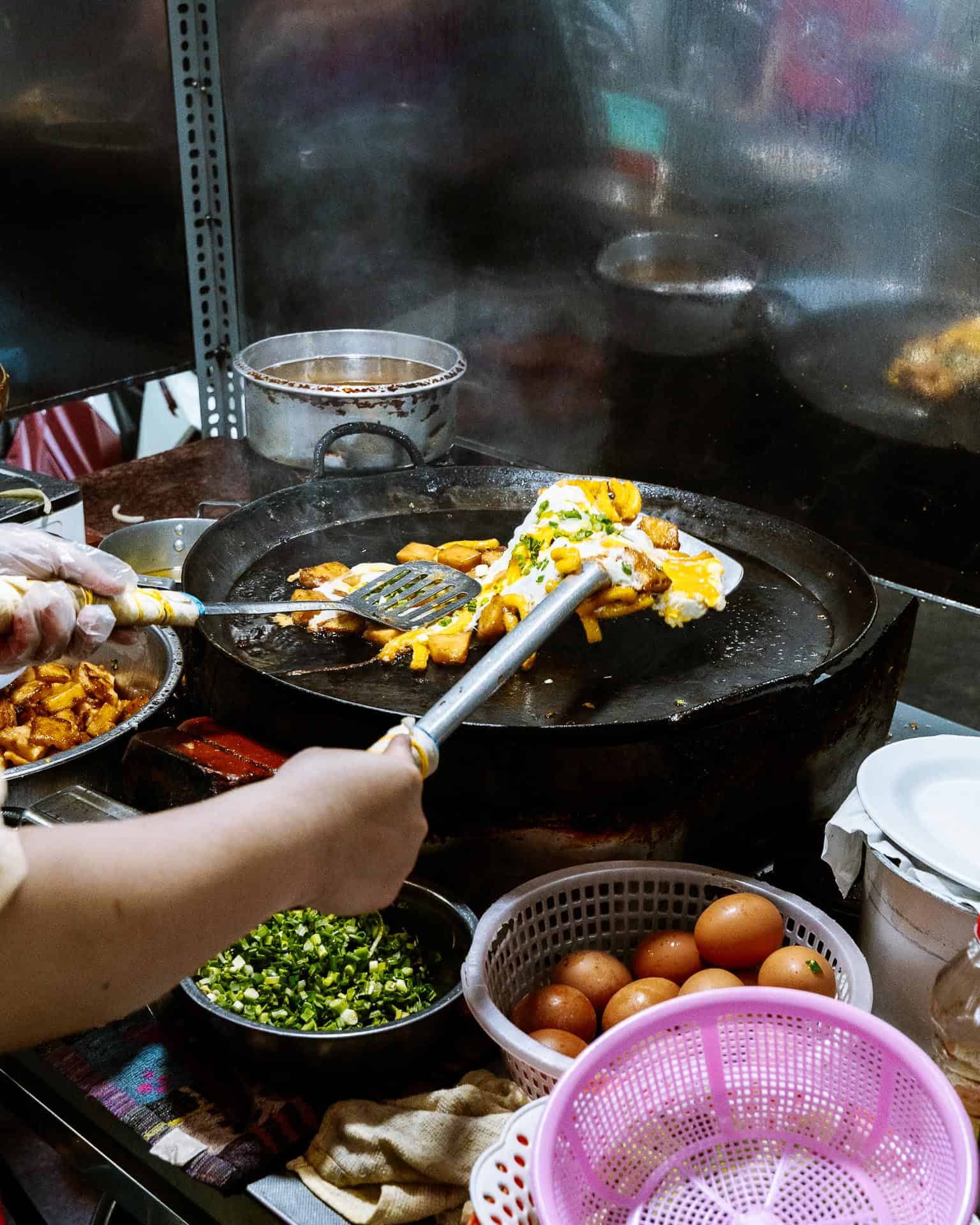 The dish consists of fried macaroni, rice flour cakes, eggs, and green onion. It’s especially tasty because the more oil they use, the crispier and more golden brown it becomes.