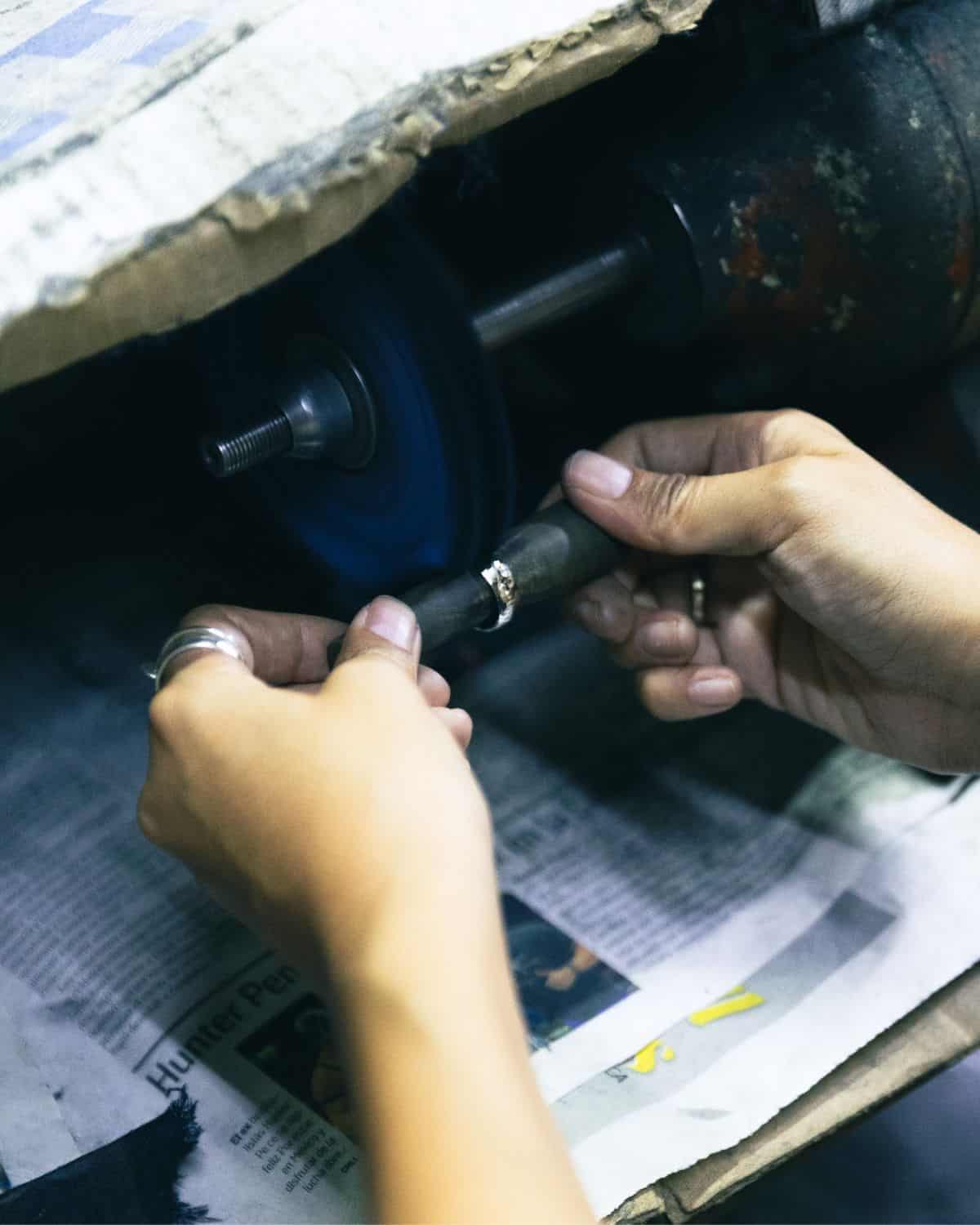 You’ll be mixing your own sterling silver alloy, stamping personalized text and textures onto the ring, fine-tuning the size, and applying the finishing touches—all under his expert guidance.